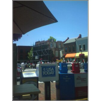 I was sitting outside at a café, eating breakfast, and a contingent of what looked like a few hundred people marched by, many wearing green and many more carrying Iranian flags, chanting “Give us our votes!” Some people were singing a song in what I took to be Farsi. I took a picture on my cell phone, though it didn’t come out too well: